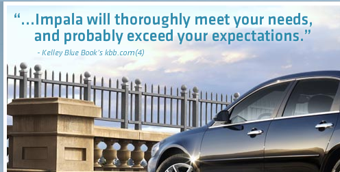 “Will probably exceed your expectations” is a bit of a backhanded compliment. Expectations for the Impala aren’t particularly high. Unfortunately, it seems to be the nicest thing anyone’s ever said about the car, so Chevrolet chose to share it as a selling point.