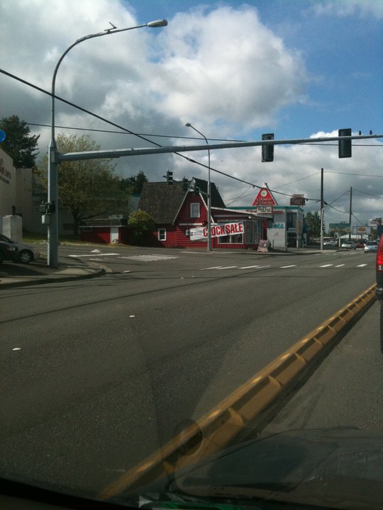 Lynnwood WA — When you approach this building, the lamp post gets in the way of the “L” in “Clocks” and appears to read “A House of Cocks”