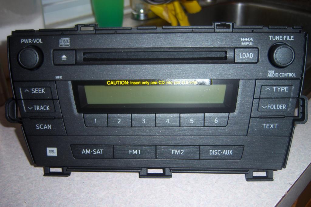 Pictured above is a factory stereo pulled from a 2011 Toyota Prius. The yellow warning sticker reads, “CAUTION: Insert only one CD into the slot at a time.”