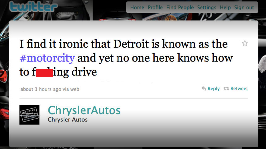 The now-unemployed sap who tweeted it worked for New Media Strategies, the firm hired by Chrysler to handle its online branding and marketing. He made the career-ending mistake of posting the following: